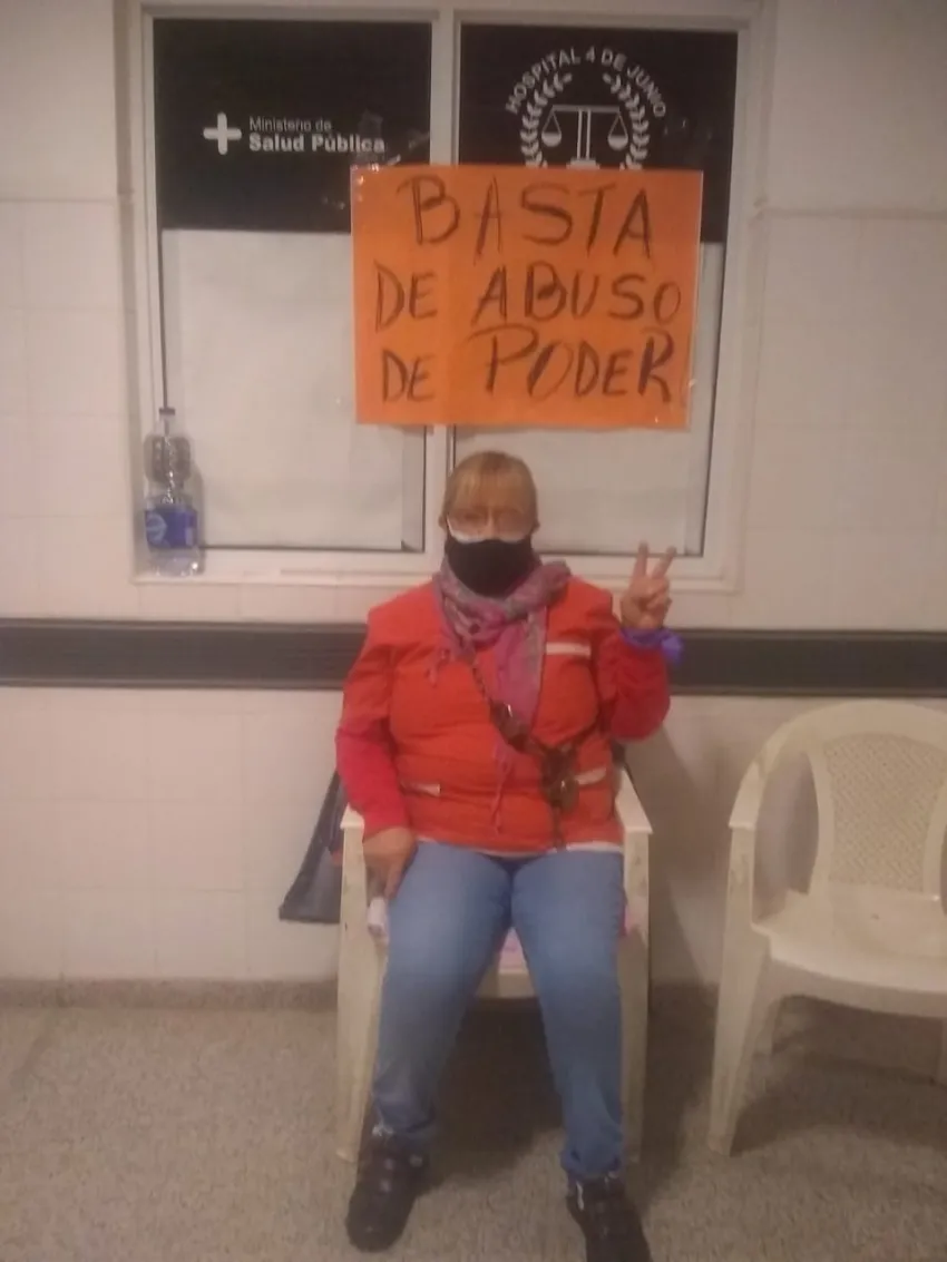Ante esta situación, decidió como medida de fuerza permanecer sentada y encadenada en el lugar, colocó una pancarta haciendo visible su reclamo en la puerta de la Dirección de Recursos Humanos del Hospital.