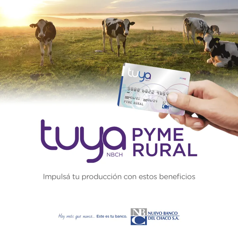 La tarjeta desarrollada por Nuevo Banco del Chaco brinda acceso a crédito permanente de acuerdo al tamaño de la producción ganadera de cada productor y permite financiar las compras en planes de cuotas. Productores rurales de toda la provincia pueden acceder a Tuya Pyme Rural, a través de las 27 sucursales del Nuevo Banco del Chaco o en forma online, completando el formulario de solicitud en https://www.nbch.com.ar/Espacio-MiPymes/Tarjetas-de-Credito/Tarjetas-Corporativas/Tuya-Pyme-Rural/Solicitud-de-Tuya-Pyme-Rural
