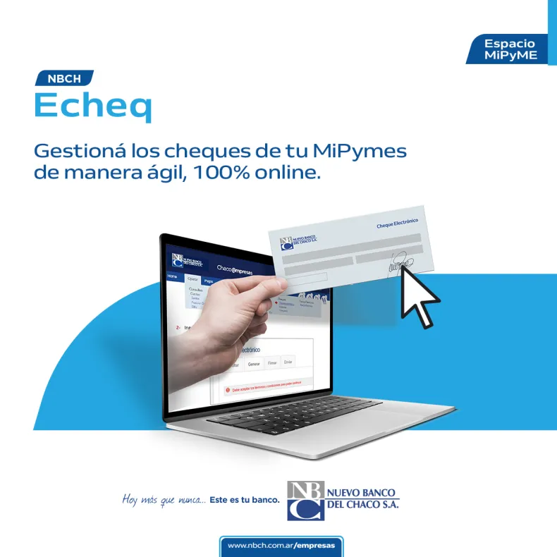 Nuevo Banco del Chaco continúa promoviendo el uso del cheque electrónico. Los Echeq tienen las mismas funcionalidades del cheque de papel, con una operatoria más eficiente, práctica y segura. A través de NBCH Echeq, se simplifica la operatoria de emisión, endoso, negociación y circulación en general, a través de canales digitales permitiendo una mayor trazabilidad. Además, se reducen los costos operativos en comparación con el cheque tradicional, se minimizan los motivos de rechazo y la posibilidad de fraude. Otra ventaja es que facilita la operatoria con terceros ubicados en zonas remotas