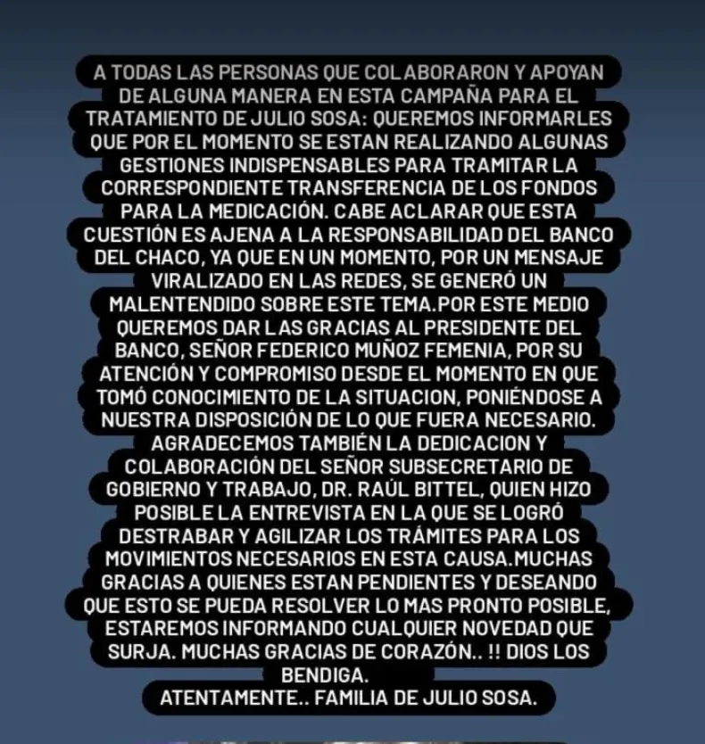 En la última información que divulgó la familia sobre el medicamento, deslindaron la responsabilidad del Nuevo Banco del Chaco al señalar que el problema para la compra del medicamento fue una "cuestión ajena" a la responsabilidad de la entidad. En un comunicado, agradecieron las gestiones y predisposiciones del presidente del NBCh y al subsecretario de Gobierno por "lograr agilizar y destrabar los tramites necesarios"