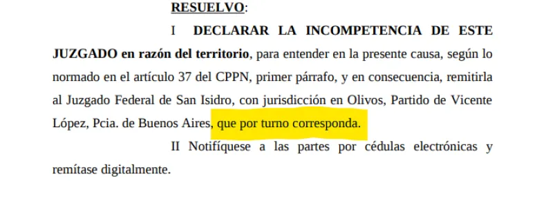 En su resolución, Casanello resolvió "declarar la incompetencia de este juzgado en razón del territorio, para entender en la presente causa, según lo normado en el artículo 37 del Código Procesal Penal de la Nación, primer párrafo, y, en consecuencia, remitirla al Juzgado Federal de San Isidro, con jurisdicción en Olivos, Partido de Vicente López, Pcia de Buenos Aires, que por turno corresponda".