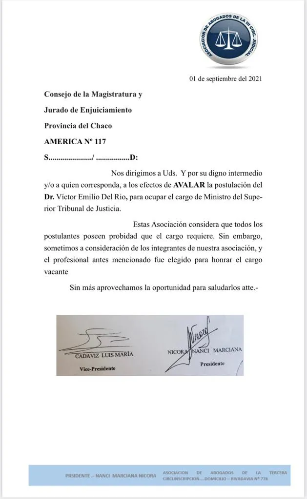 Por esto, la Asociación de Abogados de la Tercera Circunscripción presento una nota, frente al Consejo de la Magistratura y a el Jurado de Enjuiciamiento de la Provincia del Chaco, en apoyo al Juez Víctor Del Río para ocupar el cargo de ministro del Superior Tribunal de Justicia.