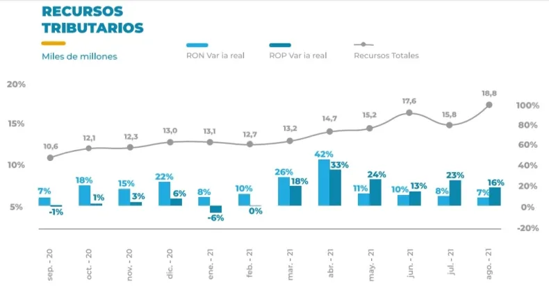 Al descontar el efecto inflacionario, el crecimiento fue de 8,3% interanual, marcando así una expansión en términos reales por décimo tercer mes consecutivo. De esta manera, en los primeros ocho meses del año los ingresos tributarios totales ascienden a $121.065 millones (+67,3% i.a.), situándose 2,6% por encima de los niveles de 2019 a precios constantes.