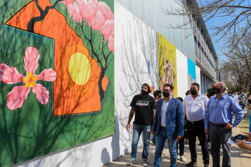El intendente de Resistencia, Gustavo Martínez, formó parte de la inauguración del paseo de murales de la parte externa del edificio de la EET N° 21 "General Manuel Belgrano", más conocida como el Colegio Industrial. "La identidad de Resistencia está tanto en las esculturas, las pinturas, los murales, la danza y la música", resaltó durante la habilitación de las obras creadas por artistas locales y de otras provincias con colaboración de estudiantes de la mencionada institución educativa, quienes son parte del programa cultural "Conciencia Ambiental", promovido por el concejal Mario Delgado.