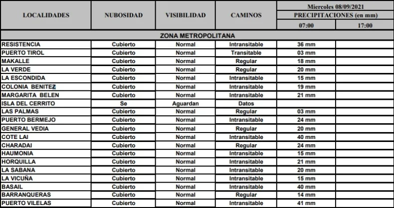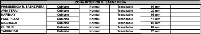 En Puerto Vilelas, por su parte cayeron 41 mm, Basail 40 mm, Cote Lai 40 mm. Sáenz Peña contó con lluvias también, pero en menor medida, hasta la mañana se registraron 7 mm.