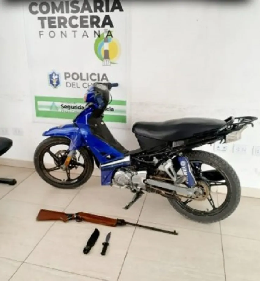 En la tarde de ayer, en Fontana, dos jóvenes de 16 y 15 años que iban en una moto Yamaha Crypton fueron detenidos por portar un rifle de aire comprimido, doce cartuchos y un cuchillo.