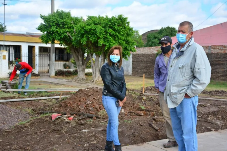 El intendente Pío Sander, acompañado de la Secretaria de Obras Públicas Natalia Aguilar y el Coordinador de Obras Carlos Kass recorrieron el lugar donde se están llevando adelante las tareas de la demolición de las estructuras ya existentes y la construcción de las nuevas veredas.