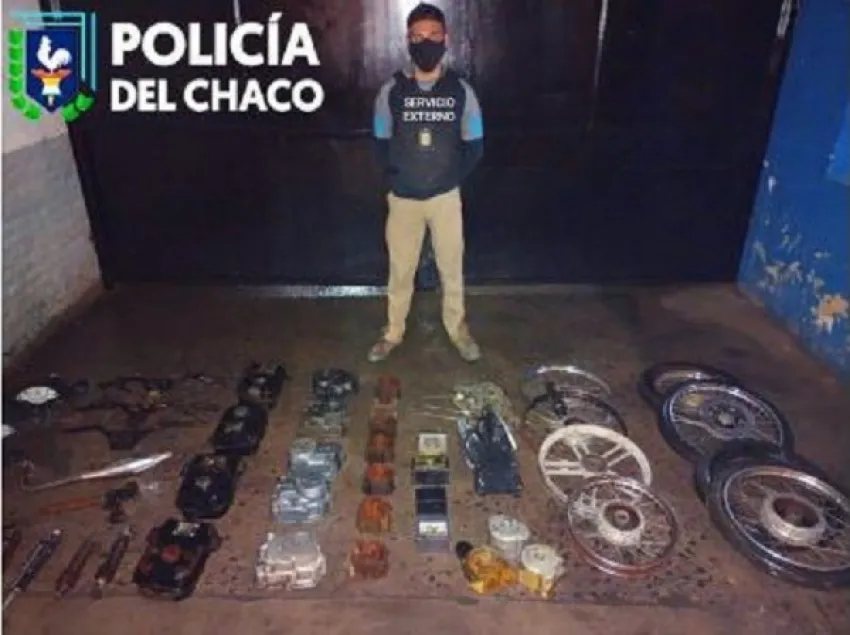 Dentro de las bolsas se encontraron ocho tapas de motor tipo 110, siete cilindros, cuatro amortiguadores, cuatro tanques de combustible, cuatro baterías de motocicletas, cuatro llantas y cuatro ruedas, tres velocímetros, tres manubrios y un caño de escape.
