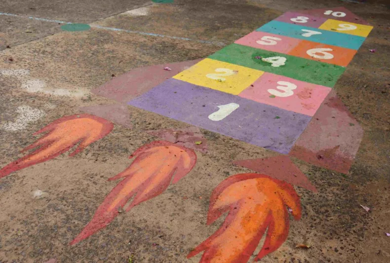 Se pintaron rayuelas saludables en el patio de la escuela N°62 Valentín Feilberg ubicada en Villa Fabiana Norte. La idea es reafirmar los contenidos propuestos por los docentes a través del juego. Además, se hizo entrega de un subibaja, una hamaca y se realizaron trabajos de limpieza integral con arreglos de espacios comunes, trabajos de zanjeo, desmalezado y se pintó el frente del jardín.