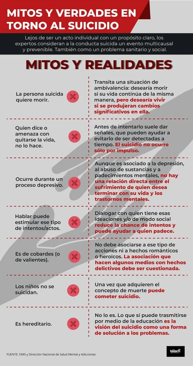 En su campaña de concientización, el Ministerio de Salud detalló que los signos de alerta son: aislamiento, persistencia de ideas negativas, dificultad para comer, dormir y trabajar, desesperanza, llanto inconsolable, repentino cambio de conducta. Y se puede colaborar en la prevención reconociendo estas señales, mostrando interés y apoyo, respetando las diferentes expresiones de sentimientos, eliminando prejuicios.