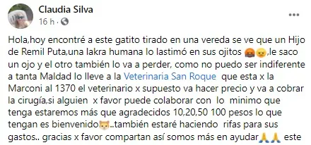 "Hoy encontré a este gatito tirado en una vereda, se ve que una lacra humana lo lastimó en sus ojitos", contó indignada Claudia Silva en redes sociales tras mostrar una fotografía de un animal brutalmente atacado.