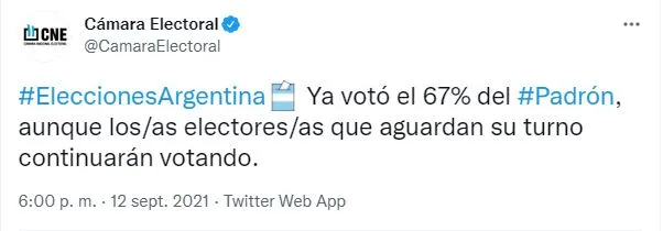 Cabe señalar que, al momento del cierre de esta nota, la Cámara Nacional Electoral informó que ya había votado el 67%, aunque remarcaron que "los electores que aguardan su turno, continuarán votando".
