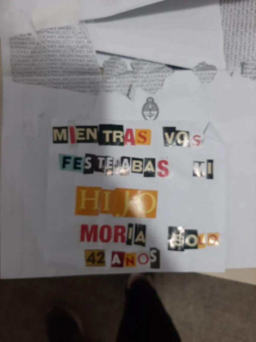 "Mientras vos festejabas, mi hijo moría solo (con) 42 años". De inmediato la fiscal de Juntos por el Cambio le sacó una foto al papel y lo subió a redes sociales. En pocos minutos la publicación se hizo viral y nuevamente generó disgusto en quienes lo leyeron.