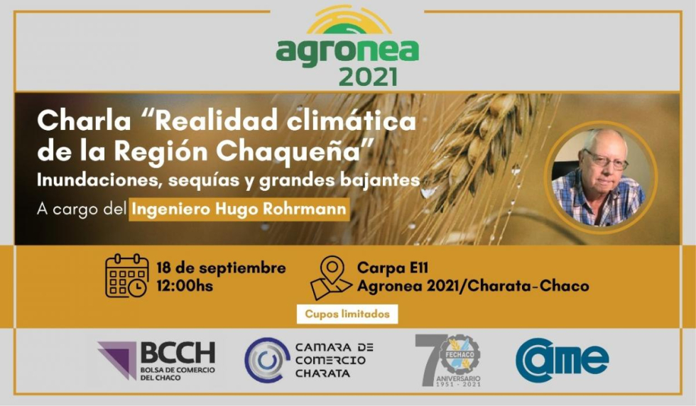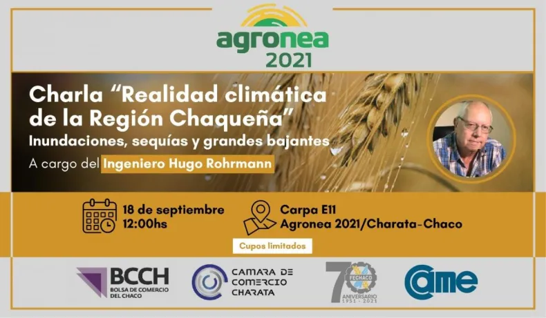 Siguiendo la agenda, a las 12 horas se llevará adelante la charla "Realidad climática de la Región Chaqueña". Inundaciones, sequías y grandes bajantes, a cargo del Ingeniero Hugo Rohrmann, quien abordará la realidad actual del clima de la región, haciendo foco en qué acciones se pueden implementar para mejorar la realidad agropecuaria.