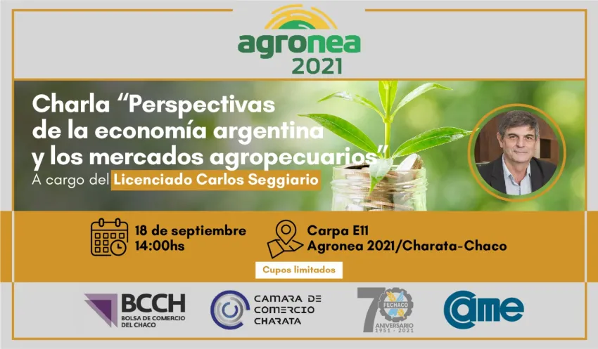 A partir de las 14 horas, se realizará la charla "Perspectivas de la economía argentina y los mercados agropecuarios", a cargo del Licenciado Carlos Seggiario, quien es Licenciado en Economía de la UNC, analista de mercados agropecuarios y miembro del equipo técnico de la Fundación Fortalecer, que subsidia servicios a productores agropecuarios con recursos del Banco Interamericano de Desarrollo (BID). También tiene una dilatada trayectoria como consultor y docente universitario.