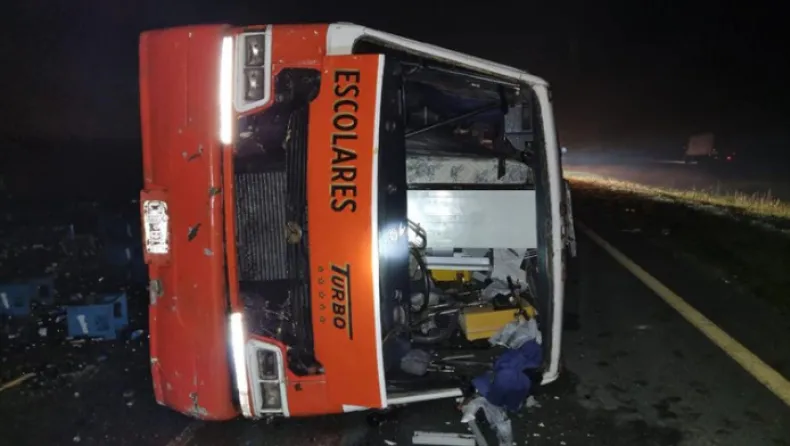 De acuerdo con las fuentes policiales consultadas por este medio, en el violento choque estuvieron involucrados un camión Mercedes Benz de color blanco que terminó volcado sobre la banquina de la Ruta 2, una camioneta Dodge Journey de color gris que estaba también dada vuelta sobre el alambrado perimetral y un micro escolar pequeño de color naranja, que luego del impacto volcó y terminó sobre ambos carriles sentido a la Costa Atlántica.