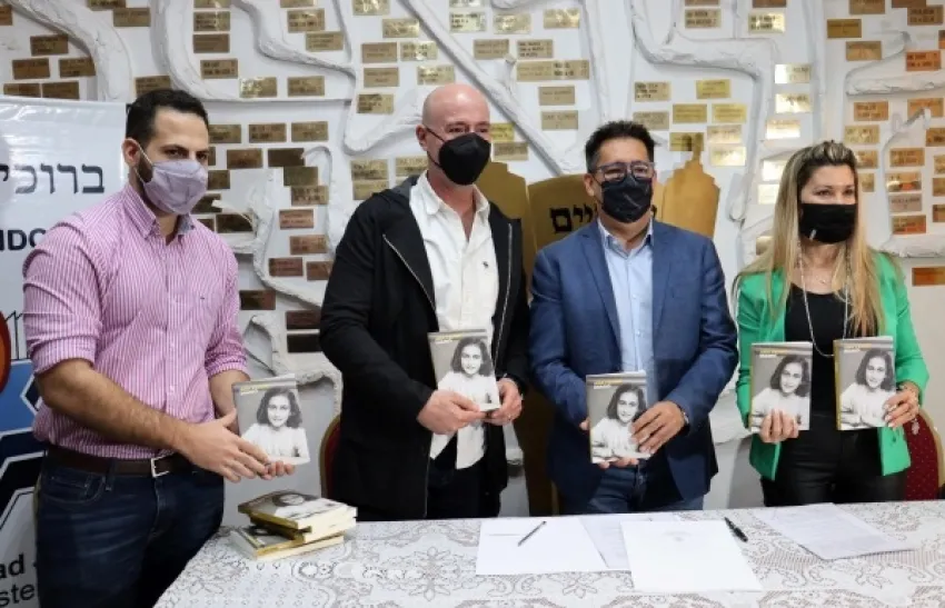 Acompañado por el titular de la entidad hebrea local, Marcelo Jaraz y la concejala Katia Blanc, el intendente donó 10 ejemplares del libro conocido universalmente como el Diario de Ana Frank.
