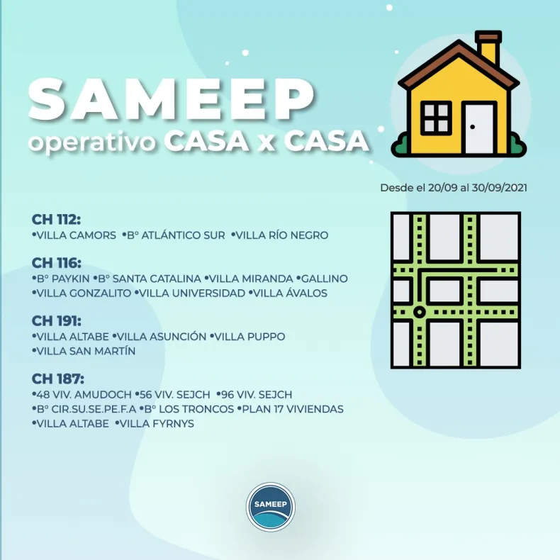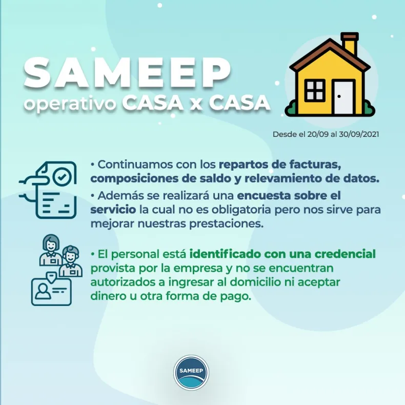Avanzando con acciones que permitan interrelacionarse con los usuarios y elevar la prestación del servicio, Sameep retomará hasta el jueves 30 de septiembre, con el operativo "Casa x Casa" que tendrá a 40 agentes de la empresa, recorriendo barrios ubicados en las chacras 112, 116, 187 y 191 de Resistencia. Durante la iniciativa, se realizará un relevamiento general, habrá reparto de facturas de consumo pendientes de pago y composiciones de saldo; además de una encuesta general.