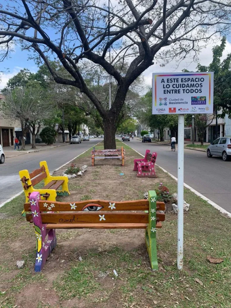 El municipio llevó a cabo la instalación de bancos, que fueron pintados por artistas de nuestra región. También se colocaron nuevos plantines y cartelería con la leyenda "A este espacio lo cuidamos entre todos".