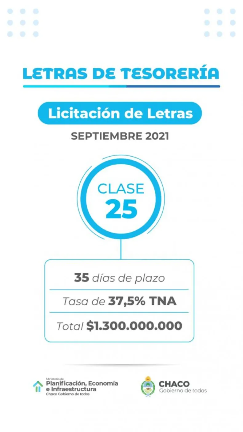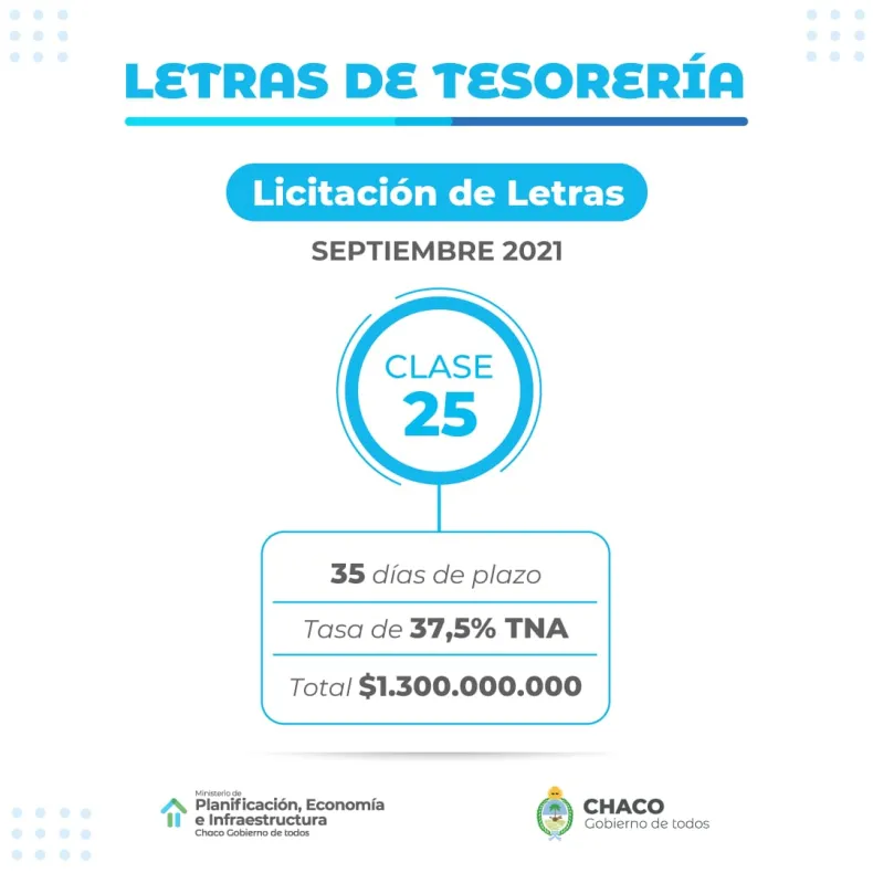 El Gobierno del Chaco, a través del Ministerio de Planificación, Economía e Infraestructura, realizó este miércoles la octava licitación del año de Letras del Tesoro, por un total de 1.300 millones de pesos.
