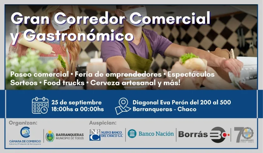 Con el objetivo de incentivar las ventas en Barranqueras y zonas de influencia, la Cámara de Comercio, Industria, Servicio y Producción de la localidad en conjunto con el Municipio local, invitan a participar del "Gran corredor comercial y gastronómico", evento que tendrá lugar este sábado, en Diagonal Eva Perón desde el 200 al 500.