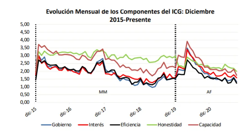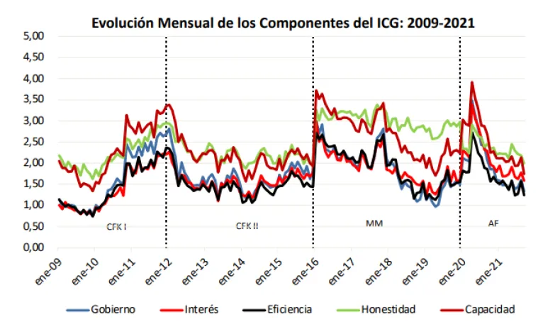 La encuesta, realizada de manera telefónica entre el 30 de agosto y el 10 de septiembre por la consultora Poliarquía, relevó que la variación intermensual con respecto a agosto fue "negativa y significativa" en todos los componentes del ICG: Eficiencia en la administración del gasto público (1,24 puntos, -21,0%), Capacidad para resolver los problemas del país (1,75 puntos, -18,0%), Evaluación general del gobierno (1,34 puntos, -16,8%), Preocupación por el interés general (1,58 puntos, -10,8%) y Honestidad de los funcionarios (1,99 puntos, -8,7%).
