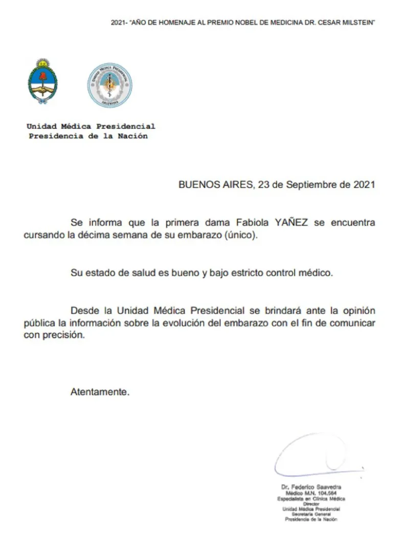 El Gobierno informó que la primera dama, Fabiola Yáñez, está cursando la décima semana de un embarazo. Según el comunicado firmado por el médico presidencial, Federico Saavedra, el estado de salud de la esposa de Alberto Fernández es bueno y se encuentra "bajo estricto control médico".