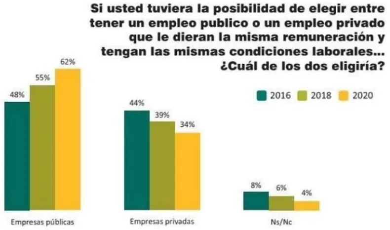 Los datos obtenidos se revelan a año vencido, es decir que los correspondientes a 2016 son los divulgados en el primer registro. En aquel momento el índice marcaba que la elección por el empleo público se ubicaba en el 48%, mientras que el privado estaba apenas por debajo, en un 44%. En 2018 las marcas mostraban que la predilección por el trabajo del Estado aumentaba al 55%, mientras que por el privado se reducía al 39%.