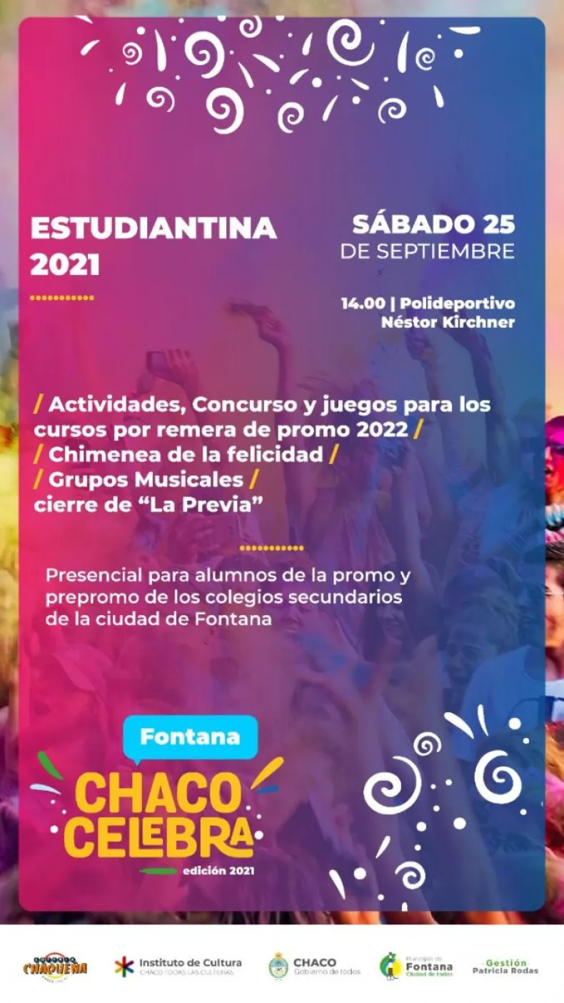 La Secretaría de Cultura, Turismo y Deportes de la Municipalidad de Fontana informó las actividades que se desarrollarán este fin de semana por el Día del Estudiante, en la previa de los festejos por el 105º aniversario de esta ciudad que tendrá lugar el día lunes 27 de septiembre.