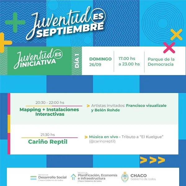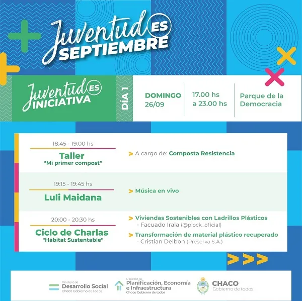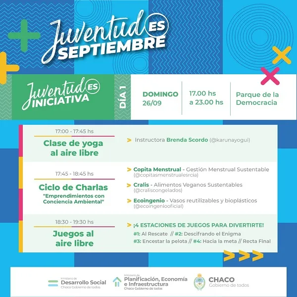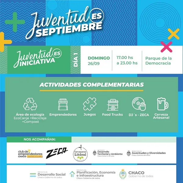 Este domingo se realizará el festival "Juventud es Iniciativa" a partir de las 17, en el Parque de la Democracia de Resistencia. Habrán puestos de exposición, emprendimientos, clases de yoga, talleres de reciclaje, de compost, posta de EcoCanje, juegos y un recital de música en vivo para cerrar la jornada, que espera reunir a centenares de jóvenes en el día de las y los estudiantes.