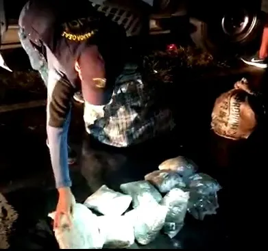 Al realizar la inspección en la camioneta, los agentes observaron que en el interior del vehículo había dos bolsas arpilleras, que tras la presencia de dos testigos determinaron que en su interior contenía 28 bolsas de nylon con "Cogollos" arrojando un pesaje de 12 kilos 319 gramos, teniendo así los primeros resultados favorables en esta investigación.