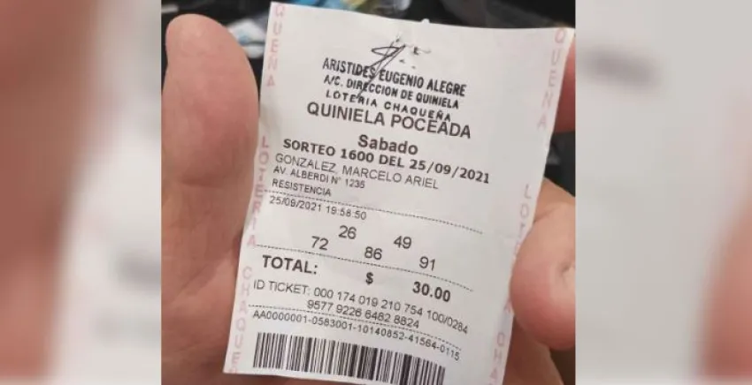 Su golpe de suerte estuvo dado por una apuesta manual, con los números 26, 49, 72, 86 y 91. "Es una jugada que venía siguiendo desde hace ocho meses", reveló el feliz ganador, quien llegó hasta la sede de Lotería Chaqueña acompañado por uno de sus hijos.
