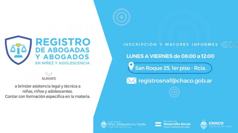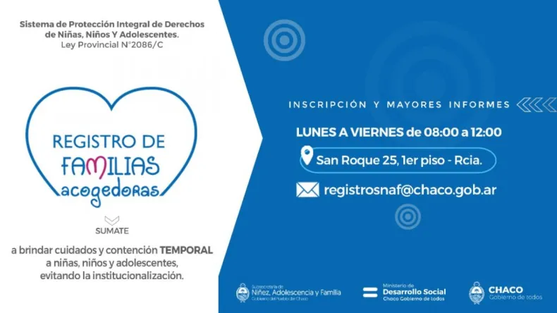 El Ministerio de Desarrollo Social invita a las y los interesados a inscribirse a los Registros de Familias Acogedoras y de Abogadas y Abogados de Niñas, Niños y Adolescentes. Los registros funcionan bajo la órbita de la Subsecretaría de Niñez, Adolescencia y Familia, con el objetivo de fortalecer al Sistema de Protección Integral de Derechos, contemplado en normativa provincial N°2086/C.