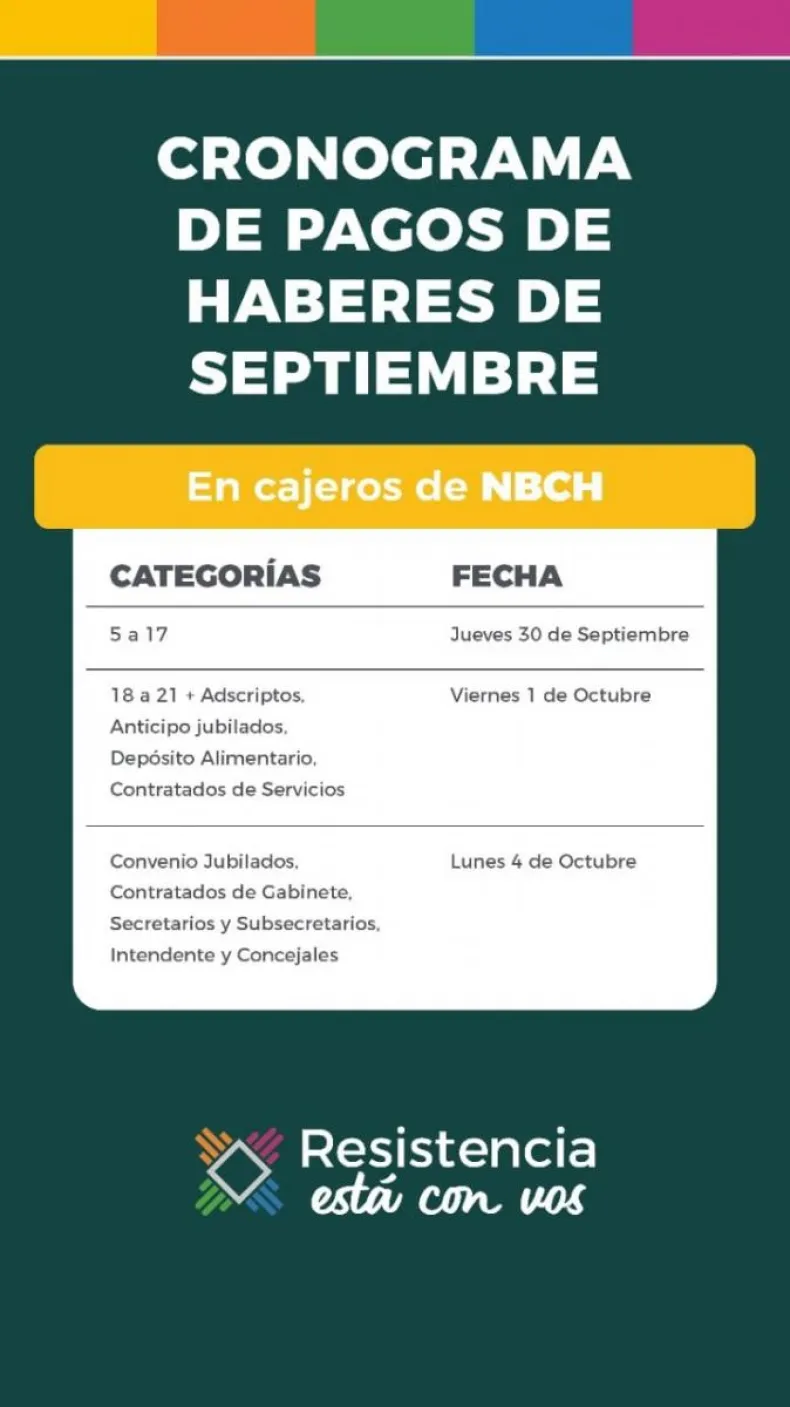 La municipalidad de Resistencia iniciará este jueves 30 de septiembre el pago de haberes correspondientes al corriente mes al personal municipal. El cronograma establecido es el siguiente: