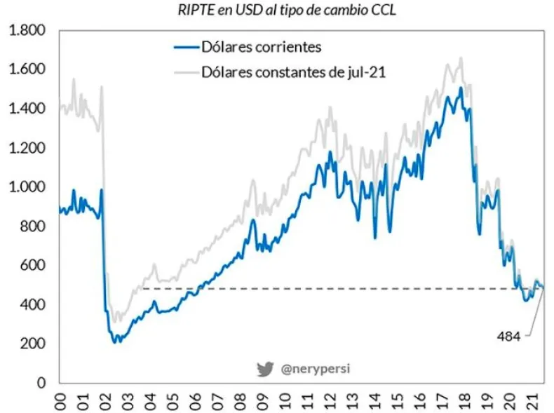 El economista Nery Persichini indicó que este declive "es el producto de que el salario nominal perdió contra la inflación en los últimos años y de que, además, el dólar libre se movió más rápido que el nivel de precios", aunque en varios períodos -como este año- el Gobierno haya buscado frenar la inflación oficial devaluando menos el tipo de cambio oficial.