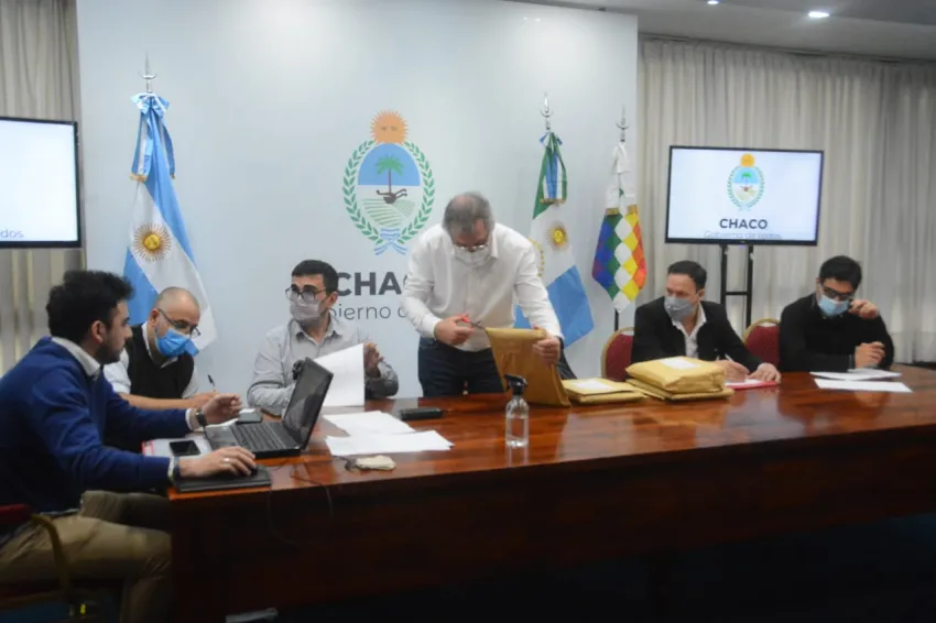 La apertura de sobres la licitación pública N° 01/2021 (10/2021 para la jurisdicción) para obras de creación, ampliación y refacción de edificios educativos, se llevó a cabo en el Salón Obligado de Casa de Gobierno, en el marco del financiamiento internacional a través del Banco de Desarrollo Fonplata.