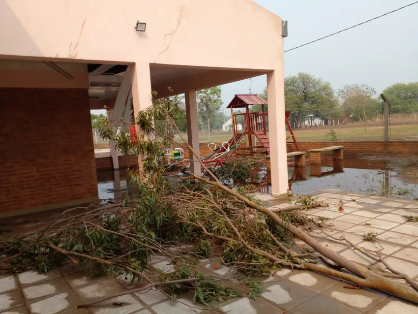 Pructo del temporal que afectó este miércoles a la zona rural de Juan José Castelli, más precisamente a los parajes El Ñandú y El Asustado, donde cayeron 80 milímetros de lluvia y hubo gran cantidad de árboles caídos, el edificio de la Escuela Primaria N° 474, sufrió severos daños, al punto tal que las clases debieron suspenderse.
