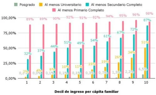 La desigualdad se profundiza al observar los datos de finalización de la educación superior. En el nivel socioeconómico más alto, el 51% de los mayores de 25 años logró completar la universidad (y el 6% además realizó estudios de posgrado). En el otro extremo, en el decil más bajo solo el 2% de la población consiguió terminar la universidad (y virtualmente nadie alcanzó un posgrado).