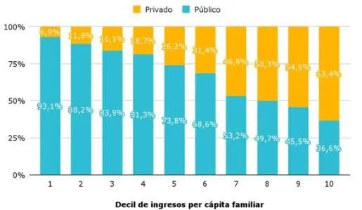 La asistencia a escuela pública o privada se asocia estrechamente con el nivel de ingresos. En primaria, el 94% de los estudiantes de menores ingresos (decil 1) asisten a escuelas públicas, mientras que la cifra desciende al 20% entre los estudiantes de mayores ingresos (decil 10): en este segmento, 8 de de cada 10 niños y niñas asisten a escuelas privadas.