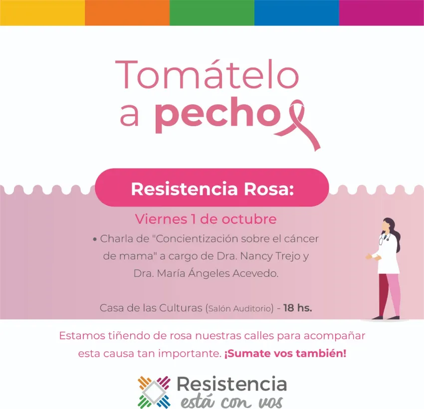 Será una actividad en la vía pública y que coordinará el programa "Tomátelo a Pecho" junto a referentes de SubastARTE; Centro Oncológico del Nordeste; Brilla Mujer; Muchas; Rotary Club; Sanatorio Sarmiento; Estudio Jurídico Contable Paniagua Lana & Asoc. y laboratorio Biolab. A partir de esta jornada, Resistencia invita a los vecinos y vecinas a hacer lo propio en sus hogares con la premisa de resaltar el color rosa, ya sea con luces o el decorado que tengan a disposición. De igual manera estarán disponibles los centros comunitarios y delegaciones municipales para intensificar el rosa en la vida cotidiana de las comunidades barriales.