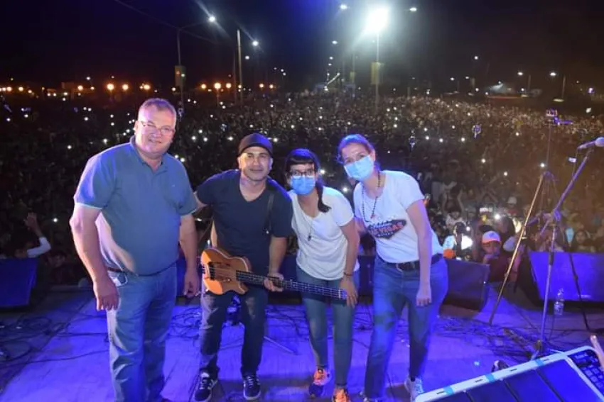 El Intendente Pio Sander junto a la Vicegobernadora Analía Rach Quiroga y la Presidenta del Concejo Soledad Rach acompañados de Matías Sotelo y Los Continuados, junto a más de veinte mil personas, cantaron a la medianoche el Feliz Cumpleaños para recibir los 85 años de Castelli.