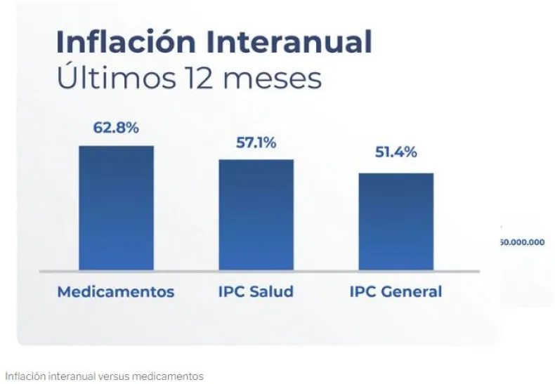 "Si se compara con el año anterior, el aumento de precios alcanzó 74,70% en el mercado total; 77,11% en los medicamentos de venta bajo receta y al 57,45% en los medicamentos de venta libre, superando en más de 23% la variación interanual a agosto de los precios al consumidor que según el Indec fue de 51,4%".