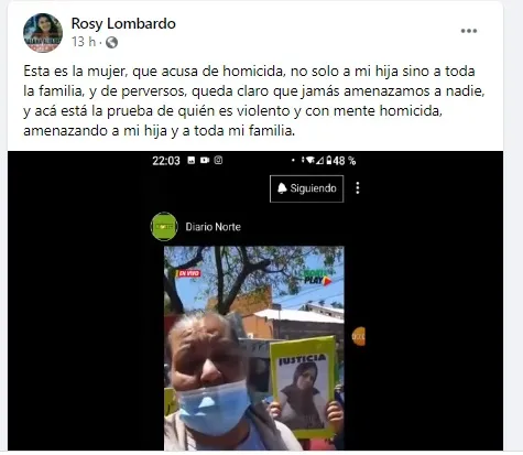 En sus redes sociales, Lombardo apuntó contra la familia Franco al advertir que tiene una "mente homicida" y al respecto explicó que "en un principio, cuando la chica recién había fallecido que se dictaminó muerte dudosa, esa familia empezó a perseguirnos en el colegio, en mi casa, mi hija no podía salir, no podíamos salir con mi nieta, nos perseguían, nos amenazaban, nos atacaron al salir del colegio con los chicos en la mano. Hicimos denuncias y jamás fueron agregadas en el expediente. Cuando todavía era -la calificación- ´muerte dudosa´ nos gritaban ´asesinos´ y un montón de cosas. Esa familia sabe muy bien qué es lo que le llevó a su hija a esta determinación".