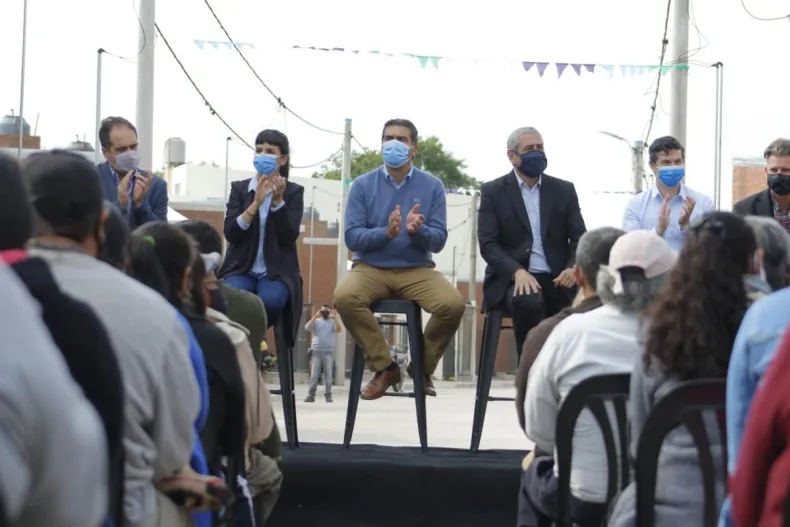 Estuvieron también presentes el secretario de Hábitat Santiago Maggiotti, el secretario de Desarrollo Territorial de la Nación Luciano Escatolini, la secretaria de Desarrollo Territorial y Ambiente de la provincia Marta Soneira, los vocales del IPDUV Mirko Nikolich y Mariano Brahim, trabajadores de las empresas que intervinieron en el proyecto. Mediante videoconferencia, la funcionaria del IPDUV, Ana Clara Buttice.