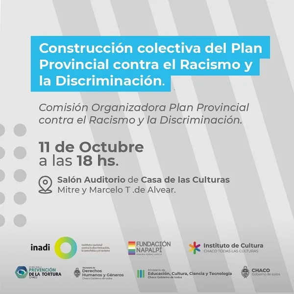 Para avanzar en la propuesta y en la actualización del plan, tanto la Secretaria de DDHH y Géneros, como la Fundación Napalpí, el Comité Provincial de Prevención de la Tortura del Chaco, el INADI, el Ministerio de Educación, Cultura, Ciencia y Tecnología y el Instituto de Cultura, invitan y convocan a todas las organizaciones sociales, políticas, culturales, deportivas y público en general a que trabajen para erradicar las prácticas discriminatorias en cualquiera de sus formas, acercándose este lunes 11 a conocer este proyecto para poder trabajar en la ejecución de las políticas públicas, entendiendo que solo las acciones articuladas entre Estado y sociedad tendrán resultados concretos, ya que las y los protagonistas en nuestro Gobierno de puertas abiertas son las personas que integran los grupos sociales históricamente discriminados y violentados, mayorías que fueron minorizadas e invisivilizadas.