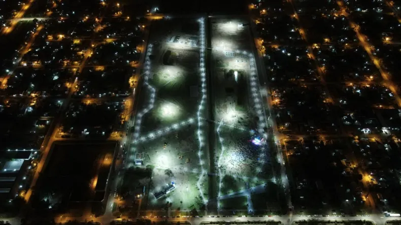 Todo el predio del parque está rodeado por un moderno sistema de torres con dispositivos led, que contempla iluminación de circulación vehicular, de grandes espacios y la iluminación puntual de senderos internos. La obra busca potenciar el encuentro y las relaciones de las y los ciudadanos en ambientes al aire libre para el cuidado sanitario de la población.