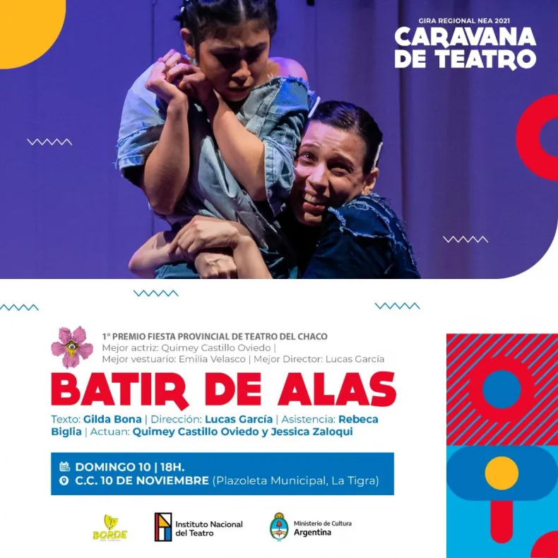 La gira "Caravana Teatro", empezará con la presentación de la obra ganadora de la Fiesta Provincial del Teatro 2021, Batir de Alas, de la autora Gilda Bona, dirigida por Lucas García, e interpretada por las actrices Quimey Castillo Oviedo y Jessica Zaloqui, la asistencia técnica de Rebeca Abril Biglia, maquillaje de Angelina Carissimo, diseño y realización de vestuario de Emilia Velasco.