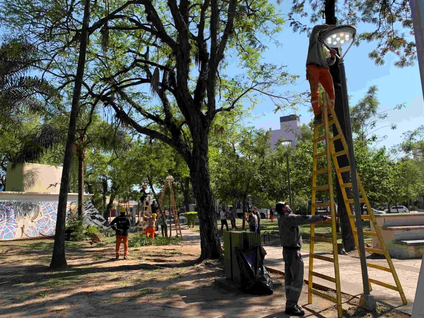 Reacondicionaron la plaza 12 de Octubre colocando nueva luminaria y plantando árboles