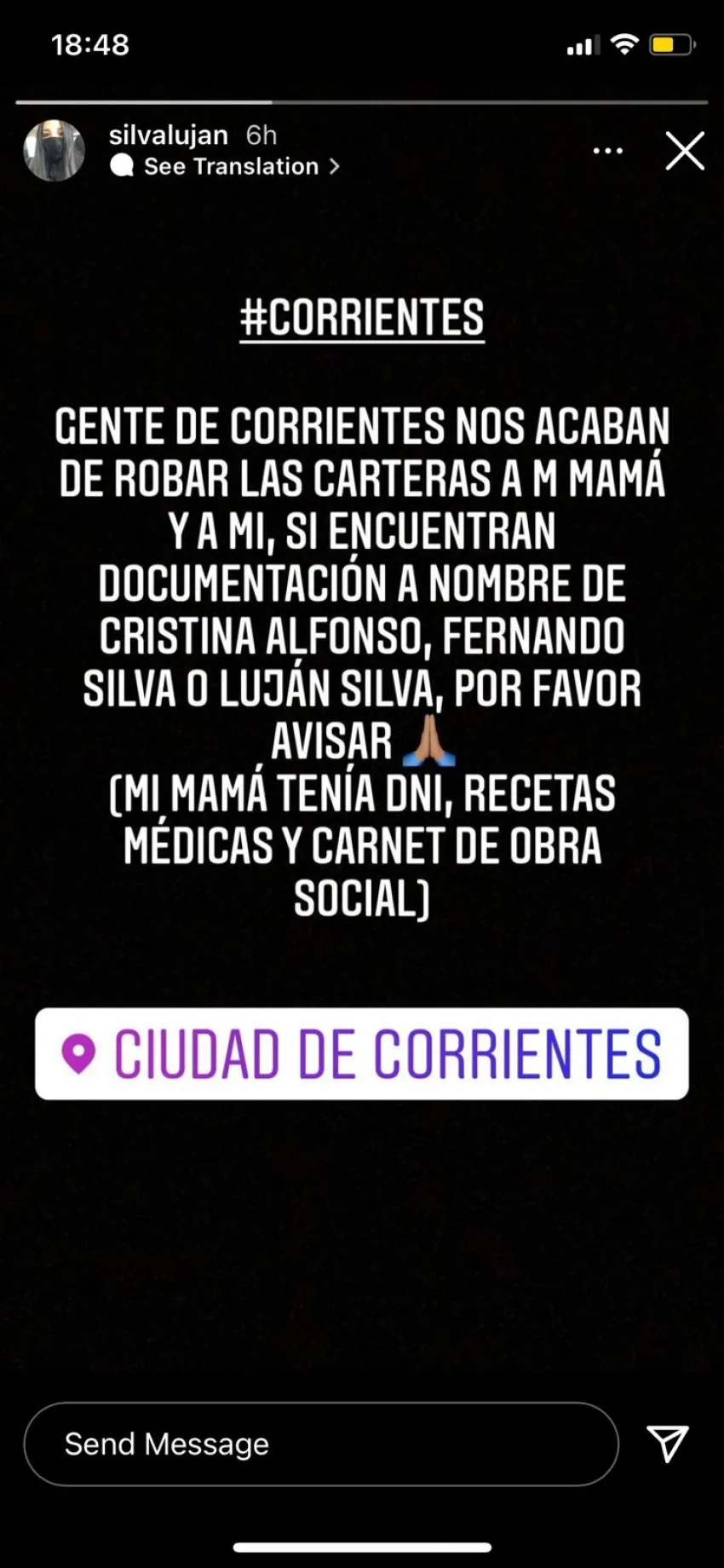 El pedido de información sobre la documentación a nombre de Cristina Alfonso, Fernando Silva o Luján Silva," por favor avisar (mi mamá tenía DNI, recetas médicas y carnet de obra social)", señala el pedido de la periodista y damnificada Luján Silva vía Instagram.
