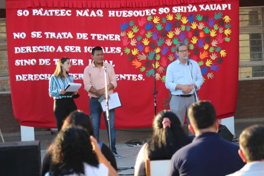 El evento, que se realizó el lunes 11, contó con la presencia del ministro de Educación, Aldo Lineras, y la subsecretaria de Interculturalidad y Plurilingüismo, Elizabeth Mendoza, entre otras autoridades, y números artísticos protagonizados por el Coro Chelaalapí, artistas locales, músicos y grupos de danzas.